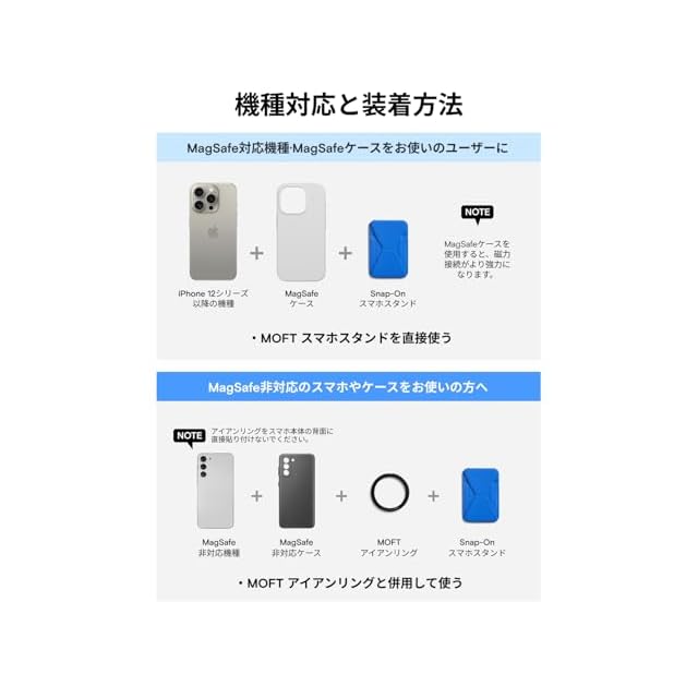 【アイアンリングと併用可能・全機種対応】iPhone 17 Pro Max/iPhone 17 Pro/iPhone Air/iPhone 17/iPhone 16 Pro Max/iPhone 16 Pro/iPhone 16 Plus/iPhone 16/iPhone 15 Pro Max/iPhone 15 Pro/iPhone 15 Plus/iPhone 15/iPhone 14 Pro Max/ iPhone 14 Pro/iPhone 14 Plus/iPhone 14/iPhone 13 Pro Max/iPhone 13 Pro/iPhone 13/iPhone 13 Mini/iPhone 12 Pro Max/iPhone 12 Pro/iPhone 12/iPhone 12 Mini 全シリーズに対応できます。背面にマグネットが付いていないスマートフォンも、アイアンリング(別売り)をスマートフォンケースに取り付けるだけで使用できます。 取り付け方法については、詳細ページをご参照ください。【注意:粘着面がある側はスマホケースまたはスマホの背面に貼り付けてください。スタンドには貼り付けないでください。】