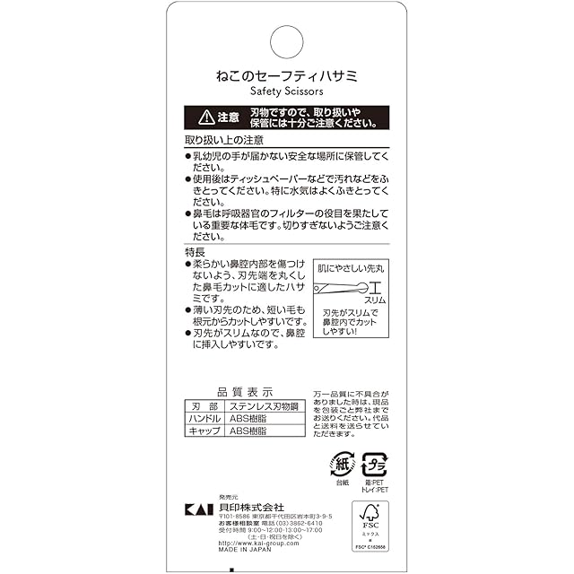 貝印 KAI ねこのセーフティハサミ 先丸刃先 薄刃 ハサミ 鼻毛 日本製 HC2202