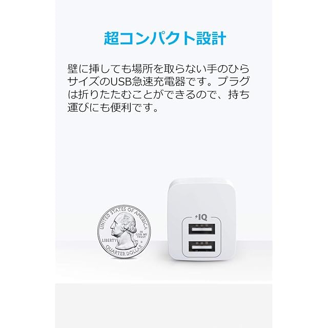 <br>Anker PowerPort mini<br><br> 2台同時に充電可能なコンパクトサイズのUSBフルスピード充電器<br><br> <br>主な製品仕様<br><br> サイズ:約30 × 33 × 38mm<br> 重さ:約38g<br> 入力:100-240V - 0.5A 50-60Hz<br> 出力:5V=2.4A(各ポート最大2.4A)<br><br> <br>全米No.1 USB充電ブランド Anker<br><br> - 最先端技術による高速かつ安全な充電 <br> - 3000万人以上が支持する信頼の品質<br><br> <br>超コンパクト設計<br><br> 壁に挿しても場所を取らない手のひらサイズのUSBフルスピード充電機です。プラグは折りたたむことができるので、持ち運びにも便利です。<br><br> <br>フルスピード充電テクノロジー<br><br> Anker独自技術のPowerIQにより、接続された機器を自動で検知し、最速で充電するために必要な最適な電流を供給することで、フルスピードでの充電が可能です。<br><br> <br>2台同時にフルスピード充電<br><br> 2ポートから合計12Wの出力が可能。モバイル機器を2台同時に充電可能です(タブレット等、2A以上の入力に対応する機器を2台同時に充電する場合、充電速度が遅くなる場合があるため、「Anker 24W 2ポート USBフルスピード充電器」をご利用ください)。<br><br> <br>多重保護システム<br><br> サージプロテクターや温度管理などの優れた機能を搭載し、お客様とお使いの機器の安全を守ります。<br><br> <br>世界でも名高い製品<br><br> Ankerは弊社製品に絶対の自信を持っています。そのため、18ヶ月と品質の高いカスタマーサポートを全ての製品に提供しています。<br><br> <br>ご注意:<br><br> 各ポート最大12Wの出力が可能ですが、2ポート同時に使用した場合も合計12W出力での充電になります。<br><br>