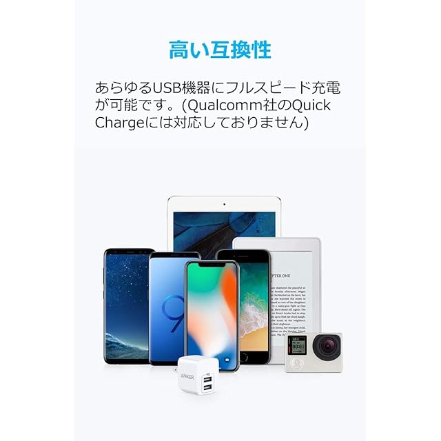 フルスピード充電技術:Anker独自のPowerIQにより、フルスピード充電が可能です(タブレット等、2A以上の入力に対応する機器を2台同時に充電する場合、充電速度が遅くなる場合があるため、「Anker 24W 2ポート USBフルスピード充電器」をご利用ください)。
