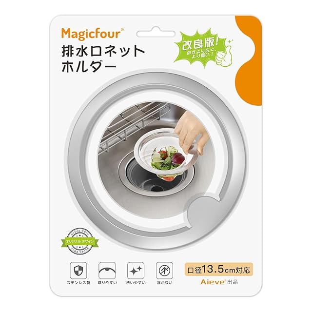 商品名:Magicfour 排水口ネットホルダー 口径13.5cm対応 枠がより広く 重く 浮かない ステンレス製 排水溝 リング はいすいこう ゴミ受け キッチン 排水溝 ゴミ受け キッチン 流し台 シンク 特許出願 広い枠/口径13.5cm対応)