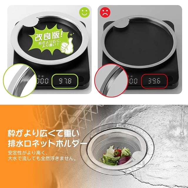 【最新改良版】お客様からのアドバイスを受けて、枠がより広くて重い排水口ネットホルダーを発売しました。安定性がより高く、大水で流しても全然浮きません。