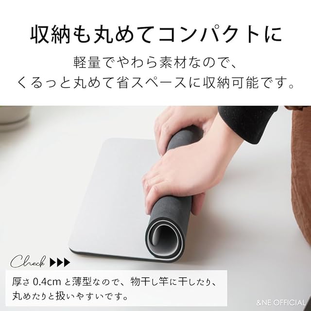 ソフトタイプなので丸めて収納やサッと干して乾燥させることができるので使い勝手も良いです。裏面はゴム製なので滑りにくく、床を傷つける心配もありません。