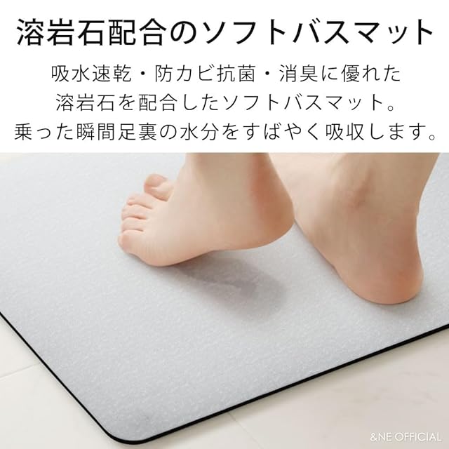 しっかり吸水、踏み心地やわらかなラバストーン配合のソフトバスマット。踏んだ時に冷たくなく1年を通してご使用いただけます。軽くてやわらかいのでお手入れも簡単で、丸めて収納も可能です。