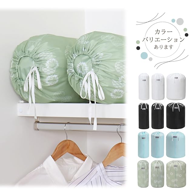 【簡単くるくる丸めて入れるだけ】:くるくると丸めて入れるだけ。長細い巾着袋で簡単にスッキリ収納。