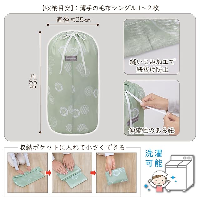 【商品仕様】:サイズ/約直径25×高さ55cm、カラー/グリーン、材質/ポリエステル、内容/1枚、収納目安/シングルサイズの薄手毛布なら1~2枚