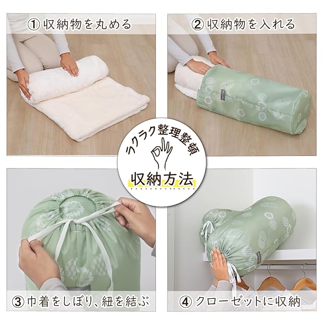 商品名:アストロ 収納袋 グリーン Mサイズ 丸めて簡単収納 毛布収納 巾着袋 収納バッグ 筒型 縦置き 積み重ね保管 626-29