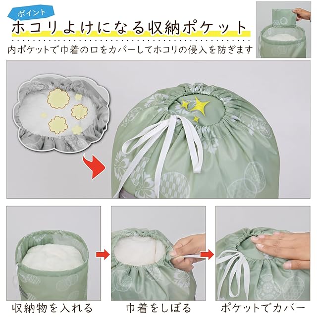 【内ポケットで巾着の口をカバー】:内ポケットで巾着の口をカバーすることで、ホコリが入るのを防ぐ。