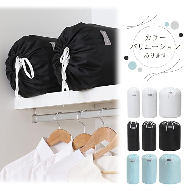 【簡単くるくる丸めて入れるだけ】:くるくると丸めて入れるだけ。長細い巾着袋で簡単にスッキリ収納。
