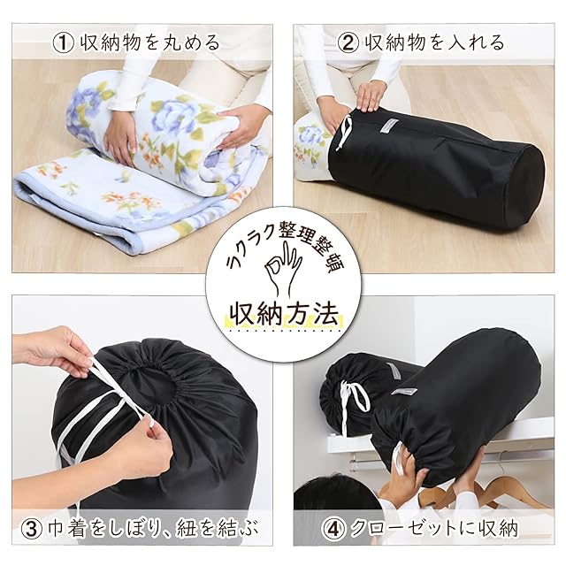 商品名:アストロ 収納袋 ブラック Mサイズ 2枚組 丸めて簡単収納 毛布収納 巾着袋 収納バッグ 筒型 縦置き 積み重ね保管 626-15