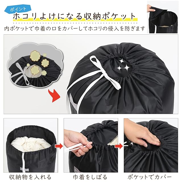 商品名:アストロ 収納袋 ブラック Lサイズ 丸めて簡単収納 羽毛布団収納 巾着袋 収納バッグ 筒型 縦置き 積み重ね保管 626-13