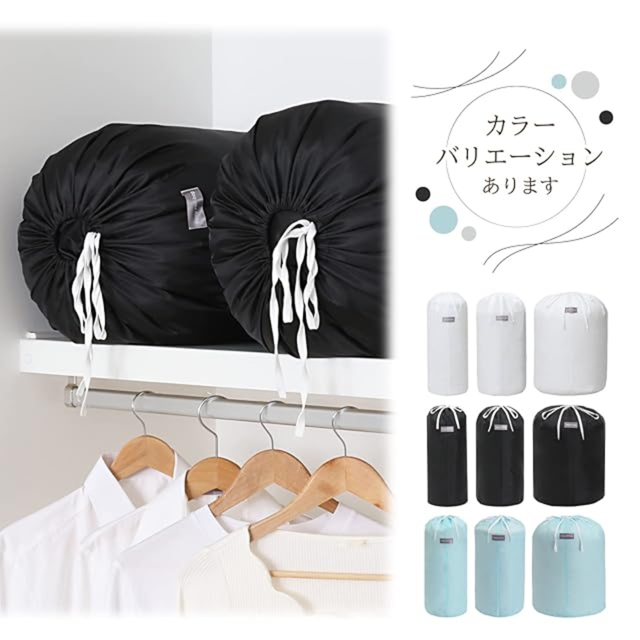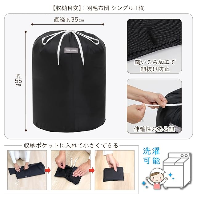 【商品仕様】:サイズ/約直径35×高さ55cm、カラー/ブラック、材質/ポリエステル、内容/1枚、収納目安/シングルサイズの羽毛布団なら1~2枚