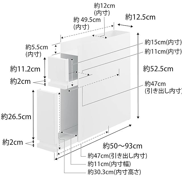 内寸サイズ:下段引き出し約W11×D47×H30.3cm、上段引き出し約W11×D47×H15cm、最上段約W12×D49.5×H5.5cm