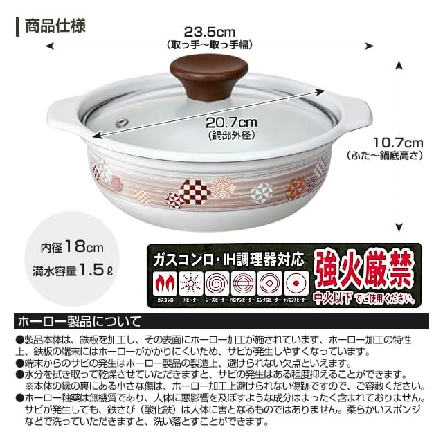 素材・材質:本体/ほうろう用鋼板、表面加工/ほうろう加工、ツマミ/メラミンフェノール樹脂、フタ/全面物理強化ガラス