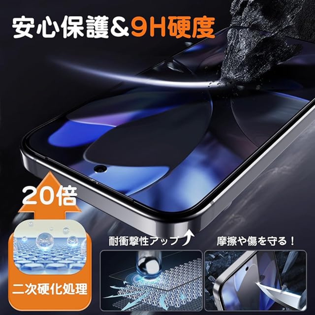 【二次硬化处理&9h硬度】Pixel 9 Pro フィルムは日本製AGCのガラス材料を採用し、一般的な熱強化処理を行った後に、二次硬化処理を行っています。1000回以上のひっかき傷テストと落下テストに無傷と、落下に対する耐性が高い。每年にわたって、日本で累計10万枚販売し、画面の破損記録がゼロとなっています。