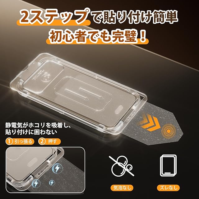 【初心者でも完璧!引っ張るだけで貼り付け完了】2ステップで、初心者でも完璧に貼り付け可能!画面に置くだけでキレイに貼れ、気泡も抜けやすい。CNC彫刻加工を採用したガイド枠はiPhone 15 Proの画面にぴったりフィットし、ズレなどのストレスから解放!