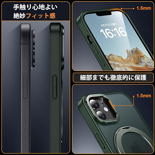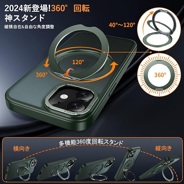 【多機能360度!縦も横も思いのまま!】:背面に搭載された嵌め込み式リングは、安定したアルミ合金製の円形スタンドを採用しており、従来のリングと比較して滑りにくく、安定したグリップを提供します。360°回転スタンド機能により、縦置き・横置きどちらの状態でも安定して利用でき、0°~ 120°の間で多角度自由に調整できます。動画視聴やFaceTimeを利用する際には、両手を解放し。外出先でも手軽に使用でき、リングやスタンドを持ち歩く必要がない。ケースを開けるだけでスタンドの完成!指にかければリングも便利に使用でき!ケースを閉じれば背面はスマートに平坦に。無限の使い方が可能で、機能性を重視する方にはぜひ手に取ってみてください!【 iphone 12/12 Pro 用 ケース アイフォン12/12 Pro 用 ケース アイホン12/12 Pro 用ケース】