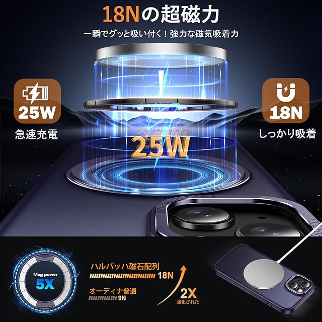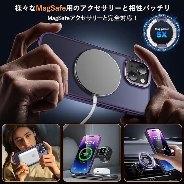 【MagSafe対応・磁力アップグレード】:強力なN52磁石を搭載しており、磁石吸着力は従来より10倍高め、ケースを装着したまま高速ワイヤレス充電が可能です、充電時の熱を周囲に発散して。Magsafe充電がかつてないほど簡単にできます!強い磁力により車運転中の激しい振動でもMagsafe車載ホルダーから外れることなく、市販のあらゆるMagsafeアクセサリーに簡単対応!いくら振っても落ちないので、充電しながらゲームをやっても問題なし!【 iphone 15 Plus 用 ケース アイフォン15Plus 用 ケース アイホン15プラス用ケース】
