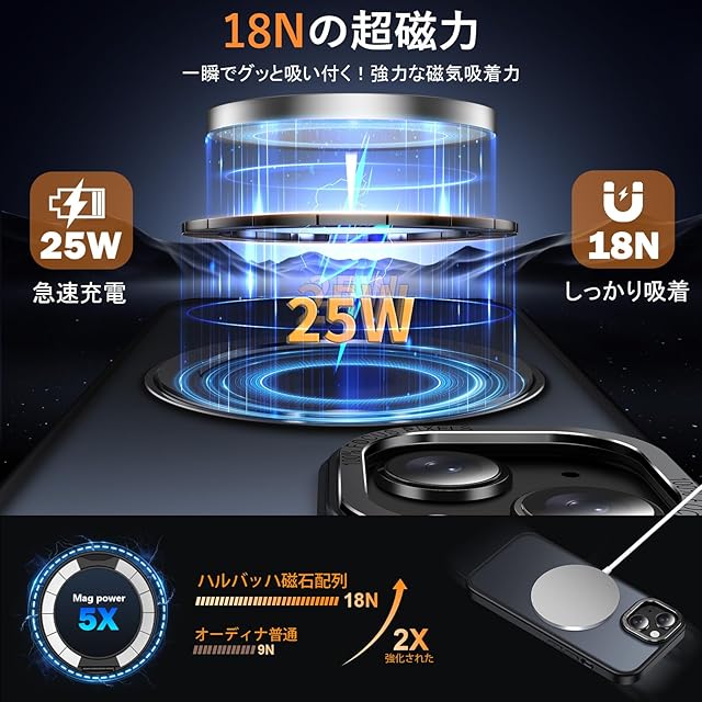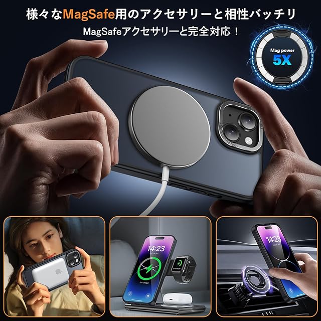 【MagSafe対応・磁力アップグレード】:強力なN52磁石を搭載しており、磁石吸着力は従来より10倍高め、ケースを装着したまま高速ワイヤレス充電が可能です、充電時の熱を周囲に発散して。Magsafe充電がかつてないほど簡単にできます!強い磁力により車運転中の激しい振動でもMagsafe車載ホルダーから外れることなく、市販のあらゆるMagsafeアクセサリーに簡単対応!いくら振っても落ちないので、充電しながらゲームをやっても問題なし!【 iphone 15 Plus 用 ケース アイフォン15Plus 用 ケース アイホン15プラス用ケース】