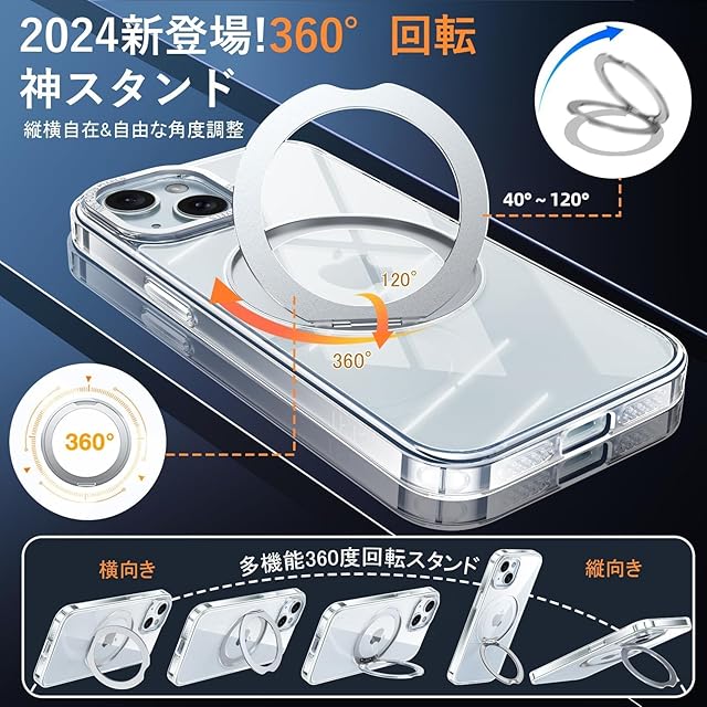【多機能360度!縦も横も思いのまま!】:背面に搭載された嵌め込み式リングは、安定したアルミ合金製の円形スタンドを採用しており、従来のリングと比較して滑りにくく、安定したグリップを提供します。360°回転スタンド機能により、縦置き・横置きどちらの状態でも安定して利用でき、0°~ 120°の間で多角度自由に調整できます。動画視聴やFaceTimeを利用する際には、両手を解放し。外出先でも手軽に使用でき、リングやスタンドを持ち歩く必要がない。ケースを開けるだけでスタンドの完成!指にかければリングも便利に使用でき!ケースを閉じれば背面はスマートに平坦に。無限の使い方が可能で、機能性を重視する方にはぜひ手に取ってみてください!【 iphone 15 用 ケース アイフォン15 用 ケース アイホン15用ケース】