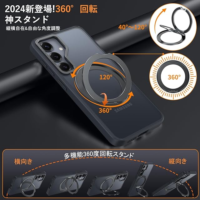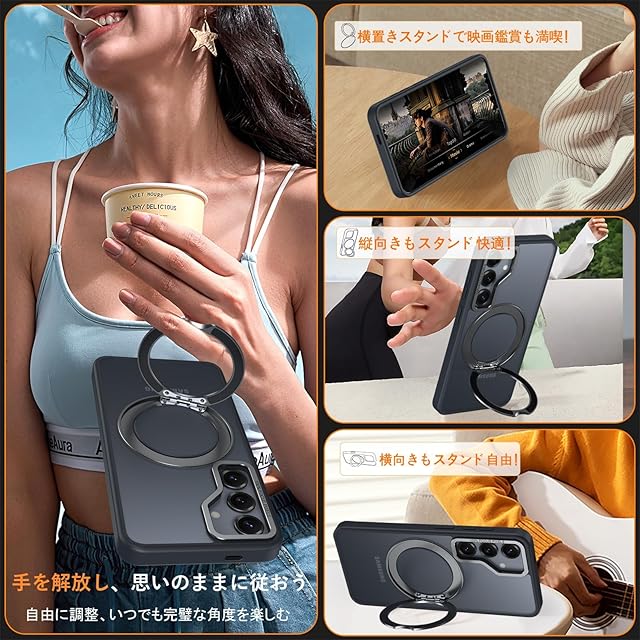 【多機能360度!縦も横も思いのまま!】:背面に搭載された嵌め込み式リングは、安定したアルミ合金製の円形スタンドを採用しており、従来のリングと比較して滑りにくく、安定したグリップを提供します。360°回転スタンド機能により、縦置き・横置きどちらの状態でも安定して利用でき、0°~ 120°の間で多角度自由に調整できます。動画視聴やFaceTimeを利用する際には、両手を解放し。外出先でも手軽に使用でき、リングやスタンドを持ち歩く必要がない。ケースを開けるだけでスタンドの完成!指にかければリングも便利に使用でき!ケースを閉じれば背面はスマートに平坦に。無限の使い方が可能で、機能性を重視する方にはぜひ手に取ってみてください!【Galaxy S25 用 ケース ギャラクシー S25 用 ケース GalaxyS25用ケース】