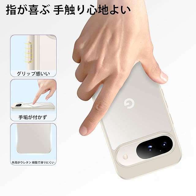 【驚くほどの透明度・黄変にくい】背面は高透明度と指紋軽減を両立したポリカーボネート素材を採用、光透過率は99%、透き通った高い透明度を誇り、pixel9本来の美しさをそのままに楽しめます。高精度表面処理また最新の黄変防止技術を使用することで、ケースを長時間使用しても鮮明で透明性を保ち、日常使用時の指紋や油汚れなどによる損失を軽減することができます。いつものスマホに上品さをプラス。