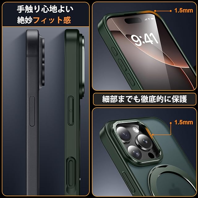 <b>互換性のある電話モデル<b>:本製品は iPhone 16 Pro Max(三眼カメラ、6.9インチ ) 専用ケース <b>付属品:<b> <br/> 1X iphone 16 Pro Max 専用ケース<br/> <b>素材:<b> ポリカーボネート素材<br/> <b>耐衝撃・キズ防止<b><br/> 高硬度・高耐傷性に誇りポリカーボネート素材を厳選、4 層緩衝構造の TPU 素材バンパー、落下からの衝撃を95%吸収し、保護性能を最大20%向上。<br/> <b> 360°回転可能スタンド機能<b><br/> 在宅勤務中や昼休憩時、会社の休憩スペースでも、昼食をとりながら動画を楽しむ。ケースを開けるだけでスタンドの完成!指にかければリングも便利に使用でき!ケースを閉じれば背面はスマートに平坦に。無限の使い方が可能で、機能性を重視する方にはぜひ手に取ってみてください!