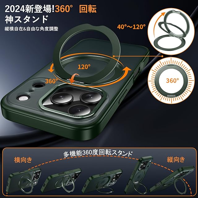 【多機能360度!縦も横も思いのまま!】:背面に搭載された嵌め込み式リングは、安定したアルミ合金製の円形スタンドを採用しており、従来のリングと比較して滑りにくく、安定したグリップを提供します。360°回転スタンド機能により、縦置き・横置きどちらの状態でも安定して利用でき、0°~ 120°の間で多角度自由に調整できます。動画視聴やFaceTimeを利用する際には、両手を解放し。外出先でも手軽に使用でき、リングやスタンドを持ち歩く必要がない。ケースを開けるだけでスタンドの完成!指にかければリングも便利に使用でき!ケースを閉じれば背面はスマートに平坦に。無限の使い方が可能で、機能性を重視する方にはぜひ手に取ってみてください!【iPhone 17 Pro 用 ケース あいふぉん 17 Pro 用 ケース アイホン 17 プロ 用ケース】