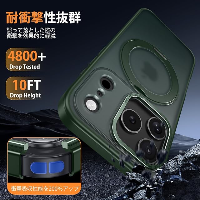 商品名:iPhone 17 Pro 用 ケース Magsafe対応 ワイヤレス充電 360°回転スタンド 縦横両対応 Gunwon スマホケース いphone17 Pro 用 米軍規格 耐衝撃 半透明 マット感 マグセーフ 防指紋 リング マグネット搭載 アイフォン17プロ 用 カバー「グリーン」