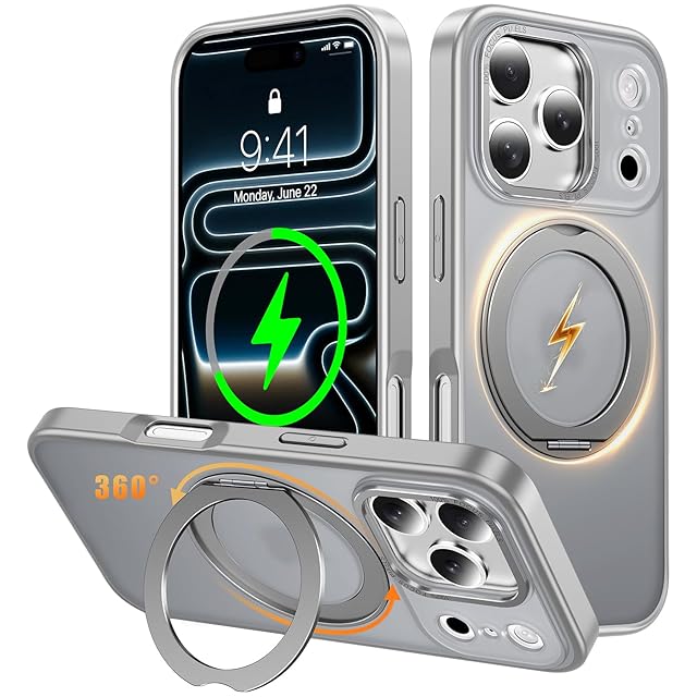 iPhone 17 Pro 用 ケース Magsafe対応 ワイヤレス充電 360°回転スタンド 縦横両対応 Gunwon スマホケース いphone17 Pro 用 米軍規格 耐衝撃 半透明 マット感 マグセーフ 防指紋 リング マグネット搭載 アイフォン17プロ 用 カバー「グレー」