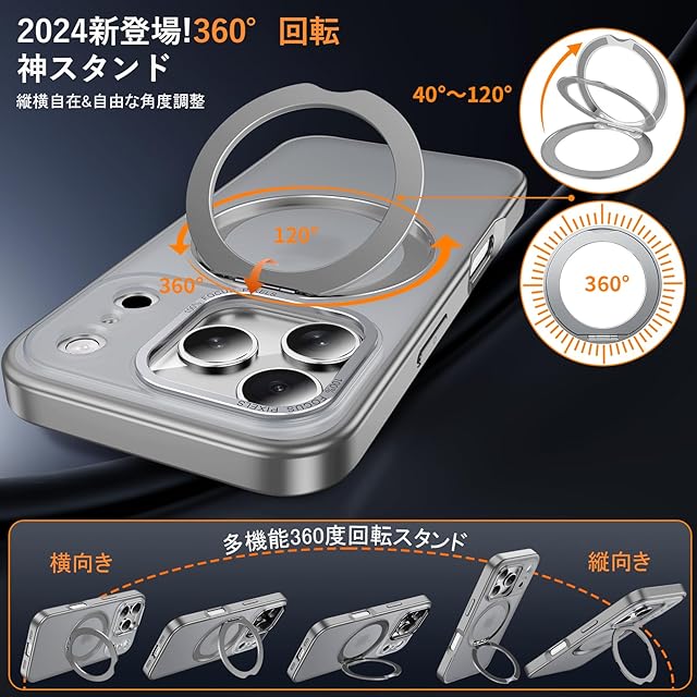 <b>互換性のある電話モデル:</b>iPhone 17 Pro 用ケース<br><br> <b>捆包:</b>1×iPhone 17 Pro 用ケース<br><br> <b>素材:</b>ポリカーボネート+アルミ合金<br><br> <b>製品機能について</b><br> <b>MagSafe 対応の強力磁吸機能</b><br> N52 マグネット搭載で、MagSafe対応アクセサリーやワイヤレス充電器とピタッと吸着。充電中のズレや干渉を防ぎ、快適な使用感を提供します。<br><br> <b>360°回転スタンドで自在な角度調整</b><br> 動画視聴・通話・ゲーム時にも理想的な角度に調整可能。縦横どちらの方向でも安定した使用が可能です。<br><br> <b>上質な触感と軽量な高級感</b><br> アルミ合金フレームとポリカーボネート素材の組み合わせで、手に馴染む上質な手触りと軽量設計を両立。長時間使用でも疲れにくく、日常使用を格上げします。<br><br> <b>抜群の耐衝撃保護性</b><br> 四隅エアバッグ構造と耐衝撃素材で、落下や衝突からスマホをしっかり守ります。