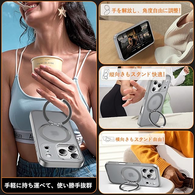 【多機能360度!縦も横も思いのまま!】:背面に搭載された嵌め込み式リングは、安定したアルミ合金製の円形スタンドを採用しており、従来のリングと比較して滑りにくく、安定したグリップを提供します。360°回転スタンド機能により、縦置き・横置きどちらの状態でも安定して利用でき、0°~ 120°の間で多角度自由に調整できます。動画視聴やFaceTimeを利用する際には、両手を解放し。外出先でも手軽に使用でき、リングやスタンドを持ち歩く必要がない。ケースを開けるだけでスタンドの完成!指にかければリングも便利に使用でき!ケースを閉じれば背面はスマートに平坦に。無限の使い方が可能で、機能性を重視する方にはぜひ手に取ってみてください!【iPhone 17 Pro 用 ケース あいふぉん 17 Pro 用 ケース アイホン 17 プロ 用ケース】
