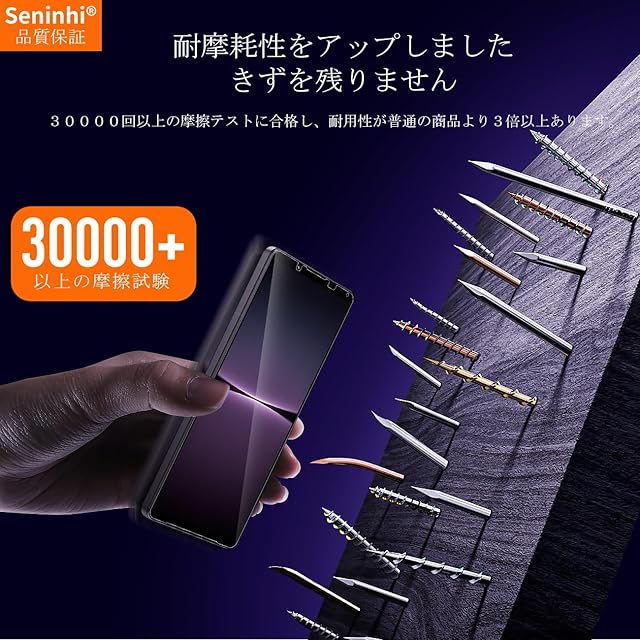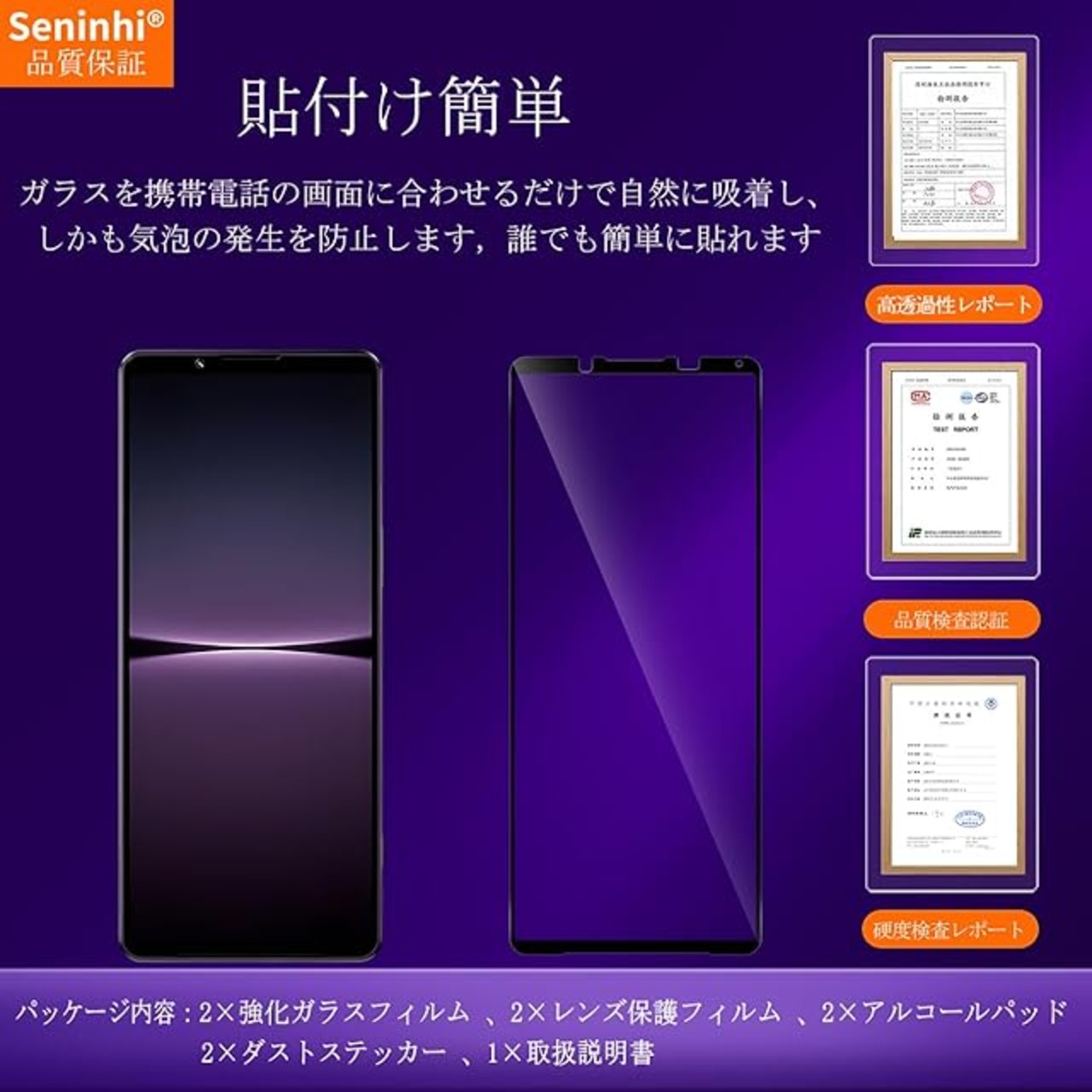 <b>【Seninhi品質を重視する】</b> <br> 対応機種: Xperia 1 IV SO-51C SOG06 強化ガラス 保護フィルム <br> <br><b> 仕様</b><br> 厚さ: 0.3mm <br>光透過率: 99% <br>素材:国産AGC旭硝子ガラス <br><b><br>【同梱品】</b><br> 2 × 強化ガラスフィルム <br>2 × レンズ保護フィルム <br>1 × 取扱説明書 <br>2 × スクリーンクリーニングキット <br>2 × ホコリ除去用ステッカー <br><br><b>【10h高硬度】</b><br> 私たちの強化フィルムは 国産AGC旭硝子ガラスを使用し、4.5時間の高温急冷と多重強化処理して、同じ厚さの通常のガラスフィルムに比べて約5倍の強さを持ち、<br> ガラスフィルムは10Hの最も硬い表面硬度に達しました。ナイフなどの鋭いものでも傷を与えません。日常生活で気軽に対応できます。<br><br><b> 【飛散防止】</b><br> 飛散防止を通して、万が一ガラスが割れても破片が飛散しなく、破片による重傷事故を減らして、とても安全です。 <br><br><b>【高感度タッチ】</b><br> この強化フィルムは0.3mmのゴールデン厚さを設計しており、防爆する同時に、感度が高いタッチ体験と連続タッチを確保し、高感度でスムーズなオンスクリーン操作を実現し、<br> ガラスフィルムを取り付けない画面とほぼ同じような使用体験を与えます。高感度でスムーズなオンスクリーン操作は様々なゲーム アプリケーションに適用します。<br><br><b> 【99%以上の携帯電話ケースに干渉しない】</b><br> 百件以上な携帯電話ケースをテストしましたが、適応率は 99%に達しました。高品質の接着剤を使用したので、<br> 携帯電話ケースに取り付けられている瞬間保護フィルムがわずかに浮き、軽く押すと気泡がきれいに消えます。<br><br><b> 【素人でも簡単に貼り付け】</b><br> ガラスフィルムの取扱説明書に張り付ける方法は詳しく記載したので、位置をよく合わせた後、上から軽く貼り付けると、シリコン吸着層が自動的に吸着し、<br> 気泡が発生しません。誰でも簡単に貼り付けられ、万が一失敗しても剥がして貼り直すことができます。<br><br><b> ご注意事項:</b><br> 1.フィルムを貼り付ける前に、手をきれいに洗ってください。<br> 2.泡があれば、クロスを指に巻きつけて少しずつ絞りだしてください。 <br>3.貼り直しによる泡を防止するため、はがす際にフィルムの粘着面に手や物が触れないようご注意ください。<br> 4. 保護フィルムは過度の衝撃等を防止するものではありません。携帯電話の故障、紛失等の責任は負いかねます。 <br><br>アフターサービス ご購入日より180日以内に初期不良や、ヒビ・欠け・ホコリ混入・サイズ違い等の使用上の問題がございましたら、<br>ご遠慮なく、いつでもお気軽にご連絡ください。私たちは具体的な問題により、お客様に満足できる解決策を提供します。