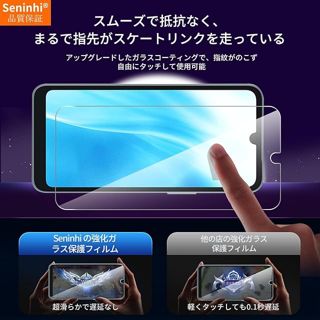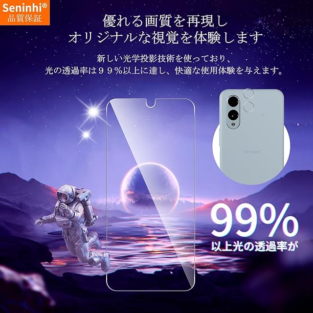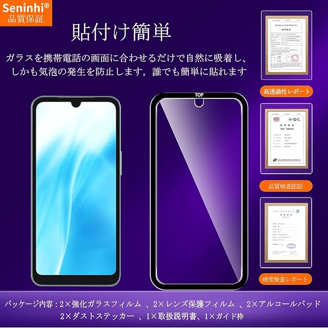 <b>【Seninhi】</b><br> Arrows We2 F-52E 強化ガラス 保護フィルム<br> <b> 仕様</b><br> 厚さ: 0.26mm <br>光透過率: 99% <br>素材:国産AGC旭硝子ガラス <br>対応機種:Arrows We2 F-52E <br><b>【同梱品】</b><br> 2 × 強化ガラスフィルム <br>2 × レンズ保護フィルム <br>1 × 取扱説明書 <br>1 × ガイド枠 <br>2 × スクリーンクリーニングキット <br>2 × ホコリ除去用ステッカー 特徴 <br><br><b>【9h高硬度】</b><br> 私たちの強化フィルムは国産AGC旭硝子ガラスを使用し、4.5時間の高温急冷と多重強化処理して、同じ厚さの通常のガラスフィルムに比べて約5倍の強さを持ち、ガラスフィルムは9Hの最も硬い表面硬度に達しました。ナイフなどの鋭いものでも傷を与えません。日常生活で気軽に対応できます。<br><br><b> 【飛散防止】</b><br> 飛散防止を通して、万が一ガラスが割れても破片が飛散しなく、破片による重傷事故を減らして、とても安全です。 <br><br><b>【高感度タッチ】</b><br> この強化フィルムは0.26mmのゴールデン厚さを設計しており、防爆する同時に、感度が高いタッチ体験と連続タッチを確保し、高感度でスムーズなオンスクリーン操作を実現し、ガラスフィルムを取り付けない画面とほぼ同じような使用体験を与えます。高感度でスムーズなオンスクリーン操作は様々なゲーム アプリケーションに適用します。<br><br><b> 【99%以上の携帯電話ケースに干渉しない】</b><br> 百件以上な携帯電話ケースをテストしましたが、適応率は 99%に達しました。高品質の接着剤を使用したので、携帯電話ケースに取り付けられている瞬間保護フィルムがわずかに浮き、軽く押すと気泡がきれいに消えます。<br><br><b> 【素人でも簡単に貼り付け】</b><br> ガラスフィルムの取扱説明書に張り付ける方法は詳しく記載したので、位置をよく合わせた後、上から軽く貼り付けると、シリコン吸着層が自動的に吸着し、気泡が発生しません。誰でも簡単に貼り付けられ、万が一失敗しても剥がして貼り直すことができます。<br><br><b> 三、ご注意事項:</b><br> 1.フィルムを貼り付ける前に、手をきれいに洗ってください。<br> 2.泡があれば、クロスを指に巻きつけて少しずつ絞りだしてください。 <br>3.貼り直しによる泡を防止するため、はがす際にフィルムの粘着面に手や物が触れないようご注意ください。<br> 4. 保護フィルムは過度の衝撃等を防止するものではありません。携帯電話の故障、紛失等の責任は負いかねます。 <br><br>四、アフターサービス ご購入日より180日以内に初期不良や、ヒビ・欠け・ホコリ混入・サイズ違い等の使用上の問題がございましたら、ご遠慮なく、いつでもお気軽にご連絡ください。私たちは具体的な問題により、お客様に満足できる解決策を提供します。