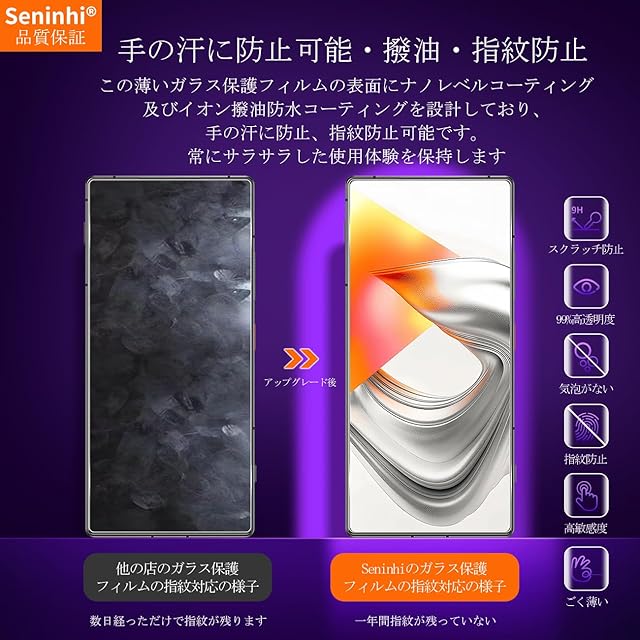 ☞【指紋防止・高感度】Nubia Z70 Ultra 強化ガラス の表面は指紋防止コーティング加工しており、画面がさらさらで指紋が付きにくい、高感度で快適な操作ができます。万が一汚れが付いても布で拭くときれいになります。