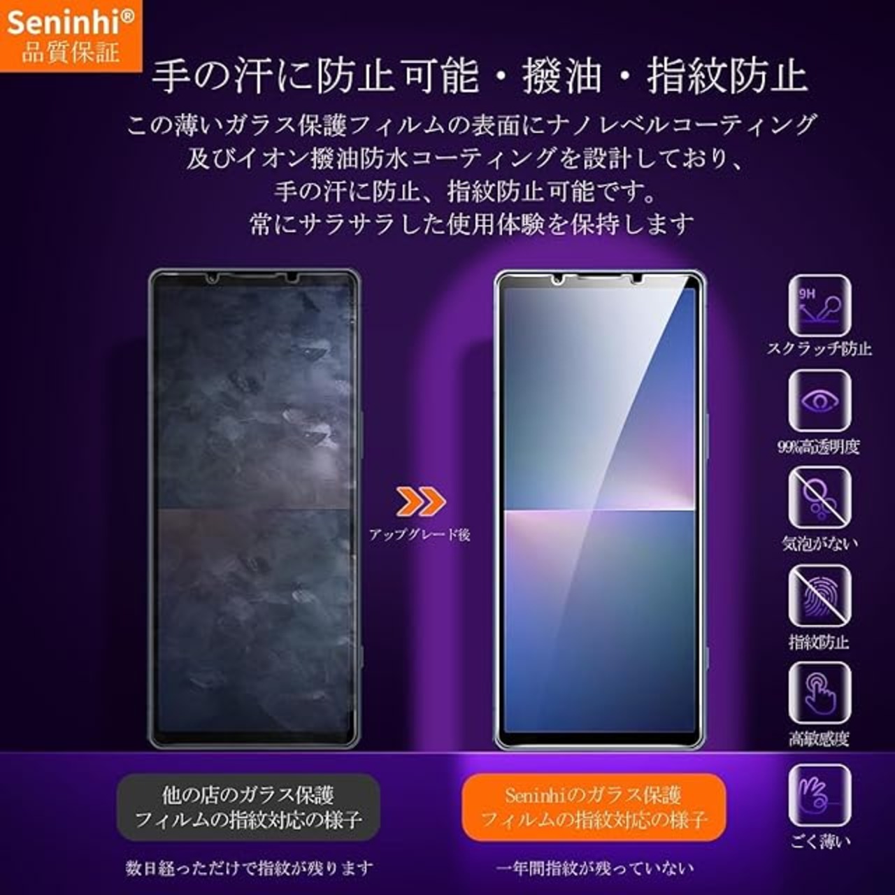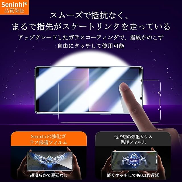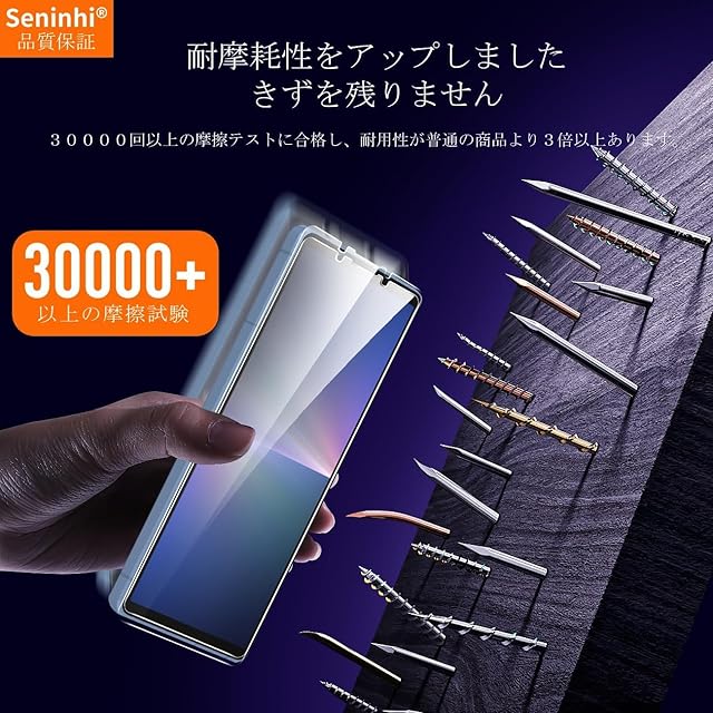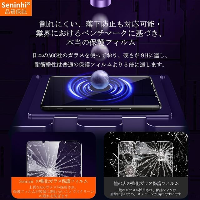 【Seninhi】対応 Sony Xperia 5 V SO-53D SOG12強化ガラス 保護フィルム について 仕様 厚さ: 0.26mm 光透過率: 99% 素材:日本AGC旭硝子ガラス 対応機種:Sony Xperia 5 V SO-53D SOG12【同梱品】 2 × 強化ガラスフィルム 2 × レンズ保護フィルム 1 × 取扱説明書 特徴 【9h高硬度】 私たちの強化フィルムは日本AGC旭硝子ガラスを使用し、4.5時間の高温急冷と多重強化処理して、同じ厚さの通常のガラスフィルムに比べて約5倍の強さを持ち、ガラスフィルムは9Hの最も硬い表面硬度に達しました。ナイフなどの鋭いものでも傷を与えません。日常生活で気軽に対応できます。 【飛散防止】 飛散防止を通して、万が一ガラスが割れても破片が飛散しなく、破片による重傷事故を減らして、とても安全です。 【高感度タッチ】 この強化フィルムは0.26mmのゴールデン厚さを設計しており、防爆する同時に、感度が高いタッチ体験と連続タッチを確保し、高感度でスムーズなオンスクリーン操作を実現し、ガラスフィルムを取り付けない画面とほぼ同じような使用体験を与えます。高感度でスムーズなオンスクリーン操作は様々なゲーム アプリケーションに適用します。 【99%以上の携帯電話ケースに干渉しない】 百件以上な携帯電話ケースをテストしましたが、適応率は 99%に達しました。高品質の接着剤を使用したので、携帯電話ケースに取り付けられている瞬間保護フィルムがわずかに浮き、軽く押すと気泡がきれいに消えます。 【素人でも簡単に貼り付け】 ガラスフィルムの取扱説明書に張り付ける方法は詳しく記載したので、位置をよく合わせた後、上から軽く貼り付けると、シリコン吸着層が自動的に吸着し、気泡が発生しません。誰でも簡単に貼り付けられ、万が一失敗しても剥がして貼り直すことができます。 三、ご注意事項: 1.フィルムを貼り付ける前に、手をきれいに洗ってください。 2.泡があれば、クロスを指に巻きつけて少しずつ絞りだしてください。 3.貼り直しによる泡を防止するため、はがす際にフィルムの粘着面に手や物が触れないようご注意ください。 4. 保護フィルムは過度の衝撃等を防止するものではありません。携帯電話の故障、紛失等の責任は負いかねます。 四、アフターサービス ご購入日より180日以内に初期不良や、ヒビ・欠け・ホコリ混入・サイズ違い等の使用上の問題がございましたら、ご遠慮なく、いつでもお気軽にご連絡ください。私たちは具体的な問題により、お客様に満足できる解決策を提供します。