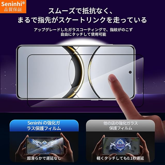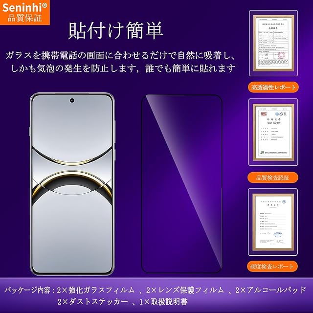<b>【Seninhi品質を重視する】</b> 対応機種: OPPO Find X8 強化ガラス 保護フィルム <br> <br><b> 仕様</b><br> 厚さ: 0.3mm <br>光透過率: 99% <br>素材:国産AGC旭硝子ガラス <br><b><br>【同梱品】</b><br> 2 × 強化ガラスフィルム <br>2 × レンズ保護フィルム <br>1 × 取扱説明書 <br>2 × スクリーンクリーニングキット <br>2 × ホコリ除去用ステッカー <br><br><b>【10h高硬度】</b><br> 私たちの強化フィルムは 国産AGC旭硝子ガラスを使用し、4.5時間の高温急冷と多重強化処理して、同じ厚さの通常のガラスフィルムに比べて約5倍の強さを持ち、<br> ガラスフィルムは10Hの最も硬い表面硬度に達しました。ナイフなどの鋭いものでも傷を与えません。日常生活で気軽に対応できます。<br><br><b> 【飛散防止】</b><br> 飛散防止を通して、万が一ガラスが割れても破片が飛散しなく、破片による重傷事故を減らして、とても安全です。 <br><br><b>【高感度タッチ】</b><br> この強化フィルムは0.3mmのゴールデン厚さを設計しており、防爆する同時に、感度が高いタッチ体験と連続タッチを確保し、高感度でスムーズなオンスクリーン操作を実現し、<br> ガラスフィルムを取り付けない画面とほぼ同じような使用体験を与えます。高感度でスムーズなオンスクリーン操作は様々なゲーム アプリケーションに適用します。<br><br><b> 【99%以上の携帯電話ケースに干渉しない】</b><br> 百件以上な携帯電話ケースをテストしましたが、適応率は 99%に達しました。高品質の接着剤を使用したので、<br> 携帯電話ケースに取り付けられている瞬間保護フィルムがわずかに浮き、軽く押すと気泡がきれいに消えます。<br><br><b> 【素人でも簡単に貼り付け】</b><br> ガラスフィルムの取扱説明書に張り付ける方法は詳しく記載したので、位置をよく合わせた後、上から軽く貼り付けると、シリコン吸着層が自動的に吸着し、<br> 気泡が発生しません。誰でも簡単に貼り付けられ、万が一失敗しても剥がして貼り直すことができます。<br><br><b> ご注意事項:</b><br> 1.フィルムを貼り付ける前に、手をきれいに洗ってください。<br> 2.泡があれば、クロスを指に巻きつけて少しずつ絞りだしてください。 <br>3.貼り直しによる泡を防止するため、はがす際にフィルムの粘着面に手や物が触れないようご注意ください。<br> 4. 保護フィルムは過度の衝撃等を防止するものではありません。携帯電話の故障、紛失等の責任は負いかねます。 <br><br>アフターサービス ご購入日より180日以内に初期不良や、ヒビ・欠け・ホコリ混入・サイズ違い等の使用上の問題がございましたら、<br>ご遠慮なく、いつでもお気軽にご連絡ください。私たちは具体的な問題により、お客様に満足できる解決策を提供します。