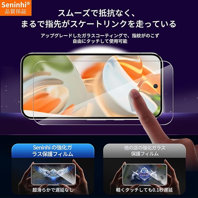 【専用設計】Google Pixel 9 Pro 専用に設計した保護フィルムなので、必ずご購入前にお使いの携帯電話の機種をご確認ください。(お買い得な4点セット)液晶保護フィルム*2枚+レンズ保護フィルム*2枚の組み合わせ、1度のご購入で、携帯電話の保護フィルムとカメラ保護フィルムが入っております。【正規品】Seninhi ブランドは 10 年間携帯電話保護フィルムの製造しており、最高品質の保護フィルムを生産することを約束します。市販の高価な保護フィルムと同じですが、価格がもっと安いので、お客様に大変ご愛顧いただき、月間販売数は20,000枚を超えました。弊社の製品は購入価値があります。安心して当社の製品をお買い求めください。