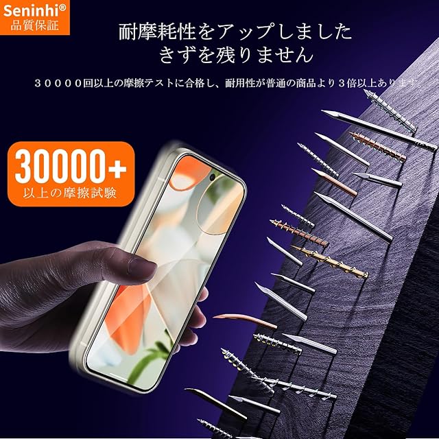 <b>【Seninhi】</b><br> Google Pixel 9 Pro 強化ガラス 保護フィルム<br> <b> 仕様 </b><br> 厚さ: 0.3mm <br>光透過率: 99% <br>素材:国産AGC旭硝子ガラス <br>対応機種: Google Pixel 9 Pro<br><b>【同梱品】</b><br> 2 × 強化ガラスフィルム<br> 2 × レンズ保護フィルム<br> 1 × 取扱説明書<br> 1 × ガイド枠 <br>2 × スクリーンクリーニングキット<br> 2 × ホコリ除去用ステッカー <br><br>特徴 <br><br><b>【9h高硬度】</b><br> 私たちの強化フィルムは国産AGC旭硝子ガラスを使用し、4.5時間の高温急冷と多重強化処理して、同じ厚さの通常のガラスフィルムに比べて約5倍の強さを持ち、ガラスフィルムは9Hの最も硬い表面硬度に達しました。ナイフなどの鋭いものでも傷を与えません。日常生活で気軽に対応できます。 <br><br><b> 【飛散防止】</b><br> 飛散防止を通して、万が一ガラスが割れても破片が飛散しなく、破片による重傷事故を減らして、とても安全です。<br><br><b> 【高感度タッチ】 </b><br> この強化フィルムは0.3mmのゴールデン厚さを設計しており、防爆する同時に、感度が高いタッチ体験と連続タッチを確保し、高感度でスムーズなオンスクリーン操作を実現し、ガラスフィルムを取り付けない画面とほぼ同じような使用体験を与えます。高感度でスムーズなオンスクリーン操作は様々なゲーム アプリケーションに適用します。 <br><br><b> 【99%以上の携帯電話ケースに干渉しない】 </b><br>百件以上な携帯電話ケースをテストしましたが、適応率は 99%に達しました。高品質の接着剤を使用したので、携帯電話ケースに取り付けられている瞬間保護フィルムがわずかに浮き、軽く押すと気泡がきれいに消えます。 <br><br><b> 【素人でも簡単に貼り付け】 </b><br> ガラスフィルムの取扱説明書に張り付ける方法は詳しく記載したので、位置をよく合わせた後、上から軽く貼り付けると、シリコン吸着層が自動的に吸着し、気泡が発生しません。誰でも簡単に貼り付けられ、万が一失敗しても剥がして貼り直すことができます。<br><br><b> 三、ご注意事項: </b><br> 1.フィルムを貼り付ける前に、手をきれいに洗ってください。<br> 2.泡があれば、クロスを指に巻きつけて少しずつ絞りだしてください。 <br> 3.貼り直しによる泡を防止するため、はがす際にフィルムの粘着面に手や物が触れないようご注意ください。 <br> 4. 保護フィルムは過度の衝撃等を防止するものではありません。携帯電話の故障、紛失等の責任は負いかねます。 <br><br>四、アフターサービス ご購入日より180日以内に初期不良や、ヒビ・欠け・ホコリ混入・サイズ違い等の使用上の問題がございましたら、ご遠慮なく、いつでもお気軽にご連絡ください。私たちは具体的な問題により、お客様に満足できる解決策を提供します。
