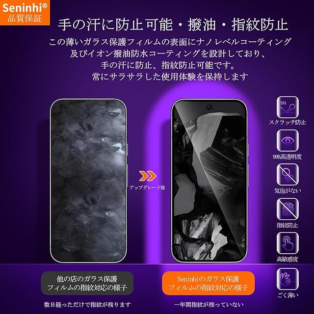<b>【Seninhi品質を重視する】</b> 対応機種: Google Pixel 9 強化ガラス 保護フィルム <br> <br><b> 仕様</b><br> 厚さ: 0.3mm <br>光透過率: 99% <br>素材:国産AGC旭硝子ガラス <br><b><br>【同梱品】</b><br> 2 × 強化ガラスフィルム <br>2 × レンズ保護フィルム <br>1 × 取扱説明書 <br>2 × スクリーンクリーニングキット <br>2 × ホコリ除去用ステッカー <br><br><b>【10h高硬度】</b><br> 私たちの強化フィルムは 国産AGC旭硝子ガラスを使用し、4.5時間の高温急冷と多重強化処理して、同じ厚さの通常のガラスフィルムに比べて約5倍の強さを持ち、<br> ガラスフィルムは10Hの最も硬い表面硬度に達しました。ナイフなどの鋭いものでも傷を与えません。日常生活で気軽に対応できます。<br><br><b> 【飛散防止】</b><br> 飛散防止を通して、万が一ガラスが割れても破片が飛散しなく、破片による重傷事故を減らして、とても安全です。 <br><br><b>【高感度タッチ】</b><br> この強化フィルムは0.3mmのゴールデン厚さを設計しており、防爆する同時に、感度が高いタッチ体験と連続タッチを確保し、高感度でスムーズなオンスクリーン操作を実現し、<br> ガラスフィルムを取り付けない画面とほぼ同じような使用体験を与えます。高感度でスムーズなオンスクリーン操作は様々なゲーム アプリケーションに適用します。<br><br><b> 【99%以上の携帯電話ケースに干渉しない】</b><br> 百件以上な携帯電話ケースをテストしましたが、適応率は 99%に達しました。高品質の接着剤を使用したので、<br> 携帯電話ケースに取り付けられている瞬間保護フィルムがわずかに浮き、軽く押すと気泡がきれいに消えます。<br><br><b> 【素人でも簡単に貼り付け】</b><br> ガラスフィルムの取扱説明書に張り付ける方法は詳しく記載したので、位置をよく合わせた後、上から軽く貼り付けると、シリコン吸着層が自動的に吸着し、<br> 気泡が発生しません。誰でも簡単に貼り付けられ、万が一失敗しても剥がして貼り直すことができます。<br><br><b> ご注意事項:</b><br> 1.フィルムを貼り付ける前に、手をきれいに洗ってください。<br> 2.泡があれば、クロスを指に巻きつけて少しずつ絞りだしてください。 <br>3.貼り直しによる泡を防止するため、はがす際にフィルムの粘着面に手や物が触れないようご注意ください。<br> 4. 保護フィルムは過度の衝撃等を防止するものではありません。携帯電話の故障、紛失等の責任は負いかねます。 <br><br>アフターサービス ご購入日より180日以内に初期不良や、ヒビ・欠け・ホコリ混入・サイズ違い等の使用上の問題がございましたら、<br>ご遠慮なく、いつでもお気軽にご連絡ください。私たちは具体的な問題により、お客様に満足できる解決策を提供します。