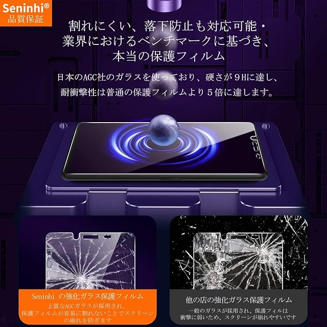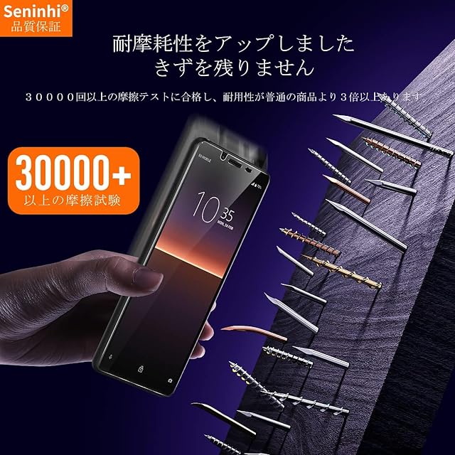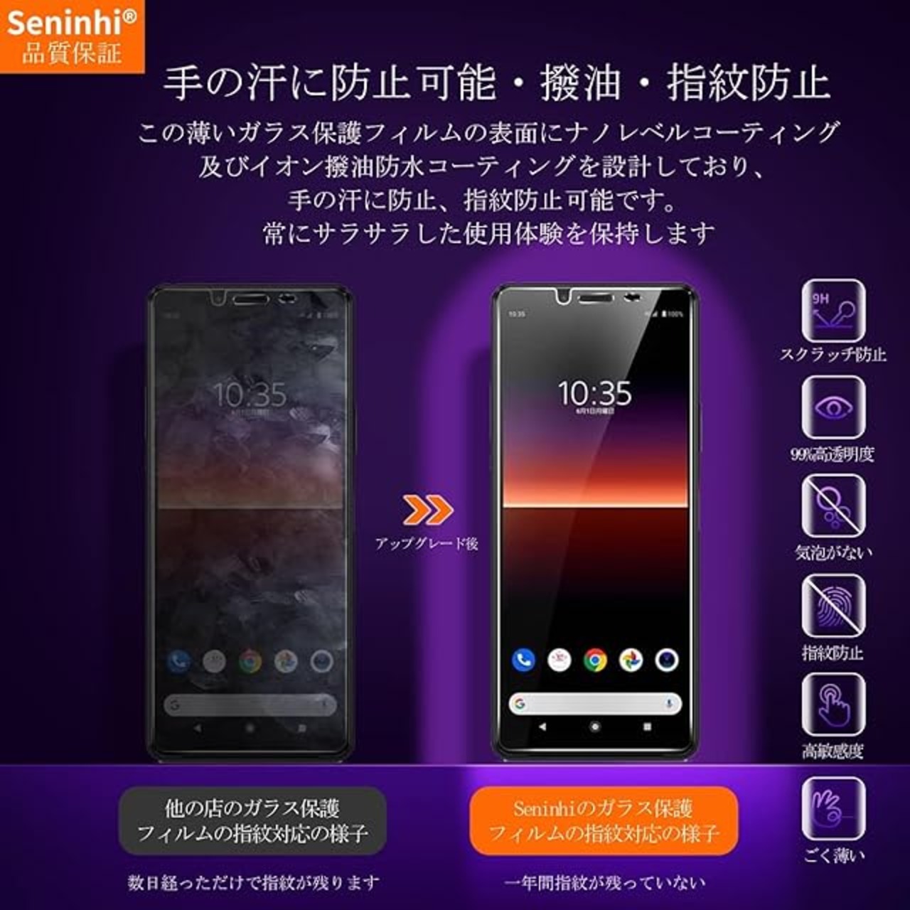 【Seninhi】 Sony Xperia 10 II docomo SO-41A au SOV43 強化ガラス 保護フィルム について 仕様 厚さ: 0.26mm 光透過率: 99% 素材:国産AGC旭硝子ガラス 対応機種:Sony Xperia 10 II docomo SO-41A au SOV43 【同梱品】 2 × 強化ガラスフィルム 2 × レンズ保護フィルム 1 × 取扱説明書 4 × スクリーンクリーニングキット 4 × ホコリ除去用ステッカー 特徴 【9h高硬度】 私たちの強化フィルムは日本AGC旭硝子ガラスを使用し、4.5時間の高温急冷と多重強化処理して、同じ厚さの通常のガラスフィルムに比べて約5倍の強さを持ち、ガラスフィルムは9Hの最も硬い表面硬度に達しました。ナイフなどの鋭いものでも傷を与えません。日常生活で気軽に対応できます。 【飛散防止】 飛散防止を通して、万が一ガラスが割れても破片が飛散しなく、破片による重傷事故を減らして、とても安全です。 【高感度タッチ】 この強化フィルムは0.26mmのゴールデン厚さを設計しており、防爆する同時に、感度が高いタッチ体験と連続タッチを確保し、高感度でスムーズなオンスクリーン操作を実現し、ガラスフィルムを取り付けない画面とほぼ同じような使用体験を与えます。高感度でスムーズなオンスクリーン操作は様々なゲーム アプリケーションに適用します。 【99%以上の携帯電話ケースに干渉しない】 百件以上な携帯電話ケースをテストしましたが、適応率は 99%に達しました。高品質の接着剤を使用したので、携帯電話ケースに取り付けられている瞬間保護フィルムがわずかに浮き、軽く押すと気泡がきれいに消えます。 【素人でも簡単に貼り付け】 ガラスフィルムの取扱説明書に張り付ける方法は詳しく記載したので、位置をよく合わせた後、上から軽く貼り付けると、シリコン吸着層が自動的に吸着し、気泡が発生しません。誰でも簡単に貼り付けられ、万が一失敗しても剥がして貼り直すことができます。 三、ご注意事項: 1.フィルムを貼り付ける前に、手をきれいに洗ってください。 2.泡があれば、クロスを指に巻きつけて少しずつ絞りだしてください。 3.貼り直しによる泡を防止するため、はがす際にフィルムの粘着面に手や物が触れないようご注意ください。 4. 保護フィルムは過度の衝撃等を防止するものではありません。携帯電話の故障、紛失等の責任は負いかねます。 四、アフターサービス ご購入日より180日以内に初期不良や、ヒビ・欠け・ホコリ混入・サイズ違い等の使用上の問題がございましたら、ご遠慮なく、いつでもお気軽にご連絡ください。私たちは具体的な問題により、お客様に満足できる解決策を提供します。 【ご注意】商品はガラス製のため、貼り付け後の落下による破損は外となります。