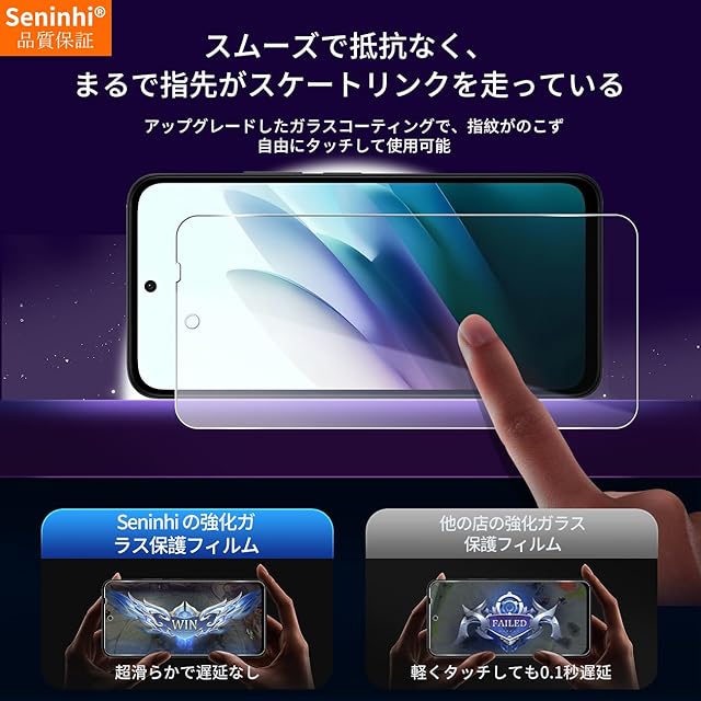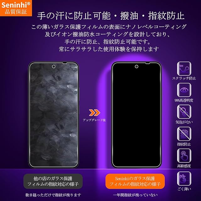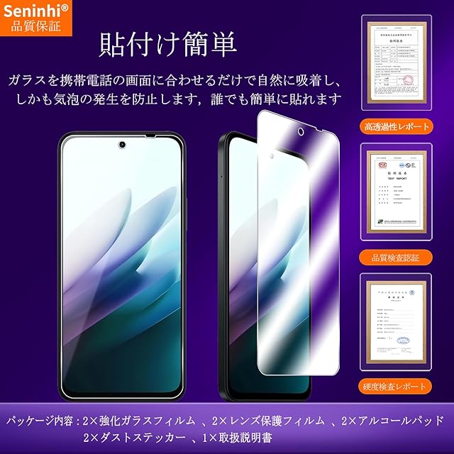 <b>【Seninhi】</b><br> Xiaomi Redmi 15 強化ガラスフィルム<br> <b> 仕様</b><br> 厚さ: 0.26mm <br>光透過率: 99% <br>素材:国産AGC旭硝子ガラス <br>対応機種:Redmi 15 5G<br><b>【同梱品】</b><br> 2 × 強化ガラスフィルム <br>2 × レンズ保護フィルム <br>1 × 取扱説明 <br>2 × スクリーンクリーニングキット <br>2 × ホコリ除去用ステッカー 特徴 <br><br><b>【9h高硬度】</b><br> 私たちの強化フィルムは国産AGC旭硝子ガラスを使用し、4.5時間の高温急冷と多重強化処理して、同じ厚さの通常のガラスフィルムに比べて約5倍の強さを持ち、ガラスフィルムは9Hの最も硬い表面硬度に達しました。ナイフなどの鋭いものでも傷を与えません。日常生活で気軽に対応できます。<br><br><b> 【飛散防止】</b><br> 飛散防止を通して、万が一ガラスが割れても破片が飛散しなく、破片による重傷事故を減らして、とても安全です。 <br><br><b>【高感度タッチ】</b><br> この強化フィルムは0.26mmのゴールデン厚さを設計しており、防爆する同時に、感度が高いタッチ体験と連続タッチを確保し、高感度でスムーズなオンスクリーン操作を実現し、ガラスフィルムを取り付けない画面とほぼ同じような使用体験を与えます。高感度でスムーズなオンスクリーン操作は様々なゲーム アプリケーションに適用します。<br><br><b> 【99%以上の携帯電話ケースに干渉しない】</b><br> 百件以上な携帯電話ケースをテストしましたが、適応率は 99%に達しました。高品質の接着剤を使用したので、携帯電話ケースに取り付けられている瞬間保護フィルムがわずかに浮き、軽く押すと気泡がきれいに消えます。<br><br><b> 【素人でも簡単に貼り付け】</b><br> ガラスフィルムの取扱説明書に張り付ける方法は詳しく記載したので、位置をよく合わせた後、上から軽く貼り付けると、シリコン吸着層が自動的に吸着し、気泡が発生しません。誰でも簡単に貼り付けられ、万が一失敗しても剥がして貼り直すことができます。<br><br><b> 三、ご注意事項:</b><br> 1.フィルムを貼り付ける前に、手をきれいに洗ってください。<br> 2.泡があれば、クロスを指に巻きつけて少しずつ絞りだしてください。 <br>3.貼り直しによる泡を防止するため、はがす際にフィルムの粘着面に手や物が触れないようご注意ください。<br> 4. 保護フィルムは過度の衝撃等を防止するものではありません。携帯電話の故障、紛失等の責任は負いかねます。 <br><br>四、アフターサービス ご購入日より180日以内に初期不良や、ヒビ・欠け・ホコリ混入・サイズ違い等の使用上の問題がございましたら、ご遠慮なく、いつでもお気軽にご連絡ください。私たちは具体的な問題により、お客様に満足できる解決策を提供します。