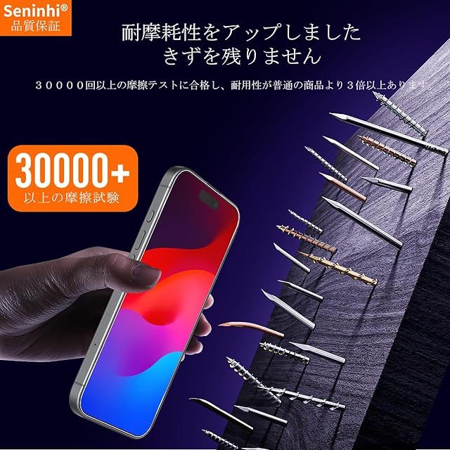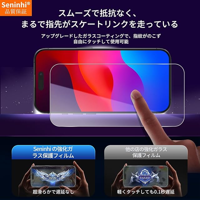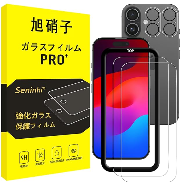 <b>【Seninhi】</b><br> iPhone 17 強化ガラス 保護フィルム<br> <b> 仕様</b><br> 厚さ: 0.26mm <br>光透過率: 99% <br>素材:国産AGC旭硝子ガラス <br>対応機種:アイフォン 17 <br><b>【同梱品】</b><br> 2 × 強化ガラスフィルム <br>2 × レンズ保護フィルム <br>1 × 取扱説明書 <br>1 × ガイド枠 <br>2 × スクリーンクリーニングキット <br>2 × ホコリ除去用ステッカー 特徴 <br><br><b>【9h高硬度】</b><br> 私たちの強化フィルムは国産AGC旭硝子ガラスを使用し、4.5時間の高温急冷と多重強化処理して、同じ厚さの通常のガラスフィルムに比べて約5倍の強さを持ち、ガラスフィルムは9Hの最も硬い表面硬度に達しました。ナイフなどの鋭いものでも傷を与えません。日常生活で気軽に対応できます。<br><br><b> 【飛散防止】</b><br> 飛散防止を通して、万が一ガラスが割れても破片が飛散しなく、破片による重傷事故を減らして、とても安全です。 <br><br><b>【高感度タッチ】</b><br> この強化フィルムは0.26mmのゴールデン厚さを設計しており、防爆する同時に、感度が高いタッチ体験と連続タッチを確保し、高感度でスムーズなオンスクリーン操作を実現し、ガラスフィルムを取り付けない画面とほぼ同じような使用体験を与えます。高感度でスムーズなオンスクリーン操作は様々なゲーム アプリケーションに適用します。<br><br><b> 【99%以上の携帯電話ケースに干渉しない】</b><br> 百件以上な携帯電話ケースをテストしましたが、適応率は 99%に達しました。高品質の接着剤を使用したので、携帯電話ケースに取り付けられている瞬間保護フィルムがわずかに浮き、軽く押すと気泡がきれいに消えます。<br><br><b> 【素人でも簡単に貼り付け】</b><br> ガラスフィルムの取扱説明書に張り付ける方法は詳しく記載したので、位置をよく合わせた後、上から軽く貼り付けると、シリコン吸着層が自動的に吸着し、気泡が発生しません。誰でも簡単に貼り付けられ、万が一失敗しても剥がして貼り直すことができます。<br><br><b> 三、ご注意事項:</b><br> 1.フィルムを貼り付ける前に、手をきれいに洗ってください。<br> 2.泡があれば、クロスを指に巻きつけて少しずつ絞りだしてください。 <br>3.貼り直しによる泡を防止するため、はがす際にフィルムの粘着面に手や物が触れないようご注意ください。<br> 4. 保護フィルムは過度の衝撃等を防止するものではありません。携帯電話の故障、紛失等の責任は負いかねます。 <br><br>四、アフターサービス ご購入日より180日以内に初期不良や、ヒビ・欠け・ホコリ混入・サイズ違い等の使用上の問題がございましたら、ご遠慮なく、いつでもお気軽にご連絡ください。私たちは具体的な問題により、お客様に満足できる解決策を提供します。