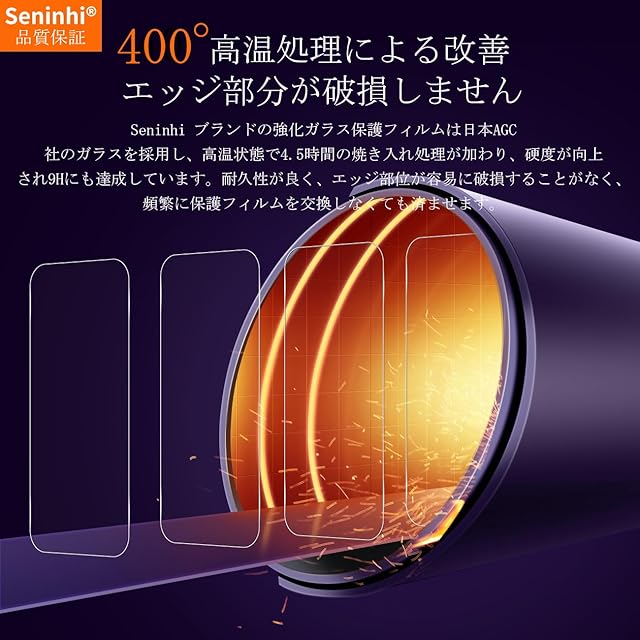 ☞【国産AGC旭硝子ガラス 素材】携帯フィルム及びレンズ保護フィルムは国産AGC旭硝子ガラスを使っており、4.5時間の高温焼入れ処理して、強化を繰り返し、硬さは業界トップレベルの9Hに達しました。市販の通常製品の5倍の硬さに達し、ナイフなどの鋭いものでも傷しません。ハードコーティング技術を利用して、外部衝撃を吸収し、防爆性をアップして、外からの衝撃に簡単に吸収して、衝突されても、画面が壊れるリスクを 99% 減らします。更に iphone 17専用の強化ガラスフィルムは飛散防止加工を行っておりますので、万が一ガラスが割れても怪我を与えません。