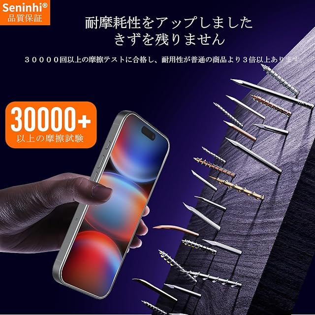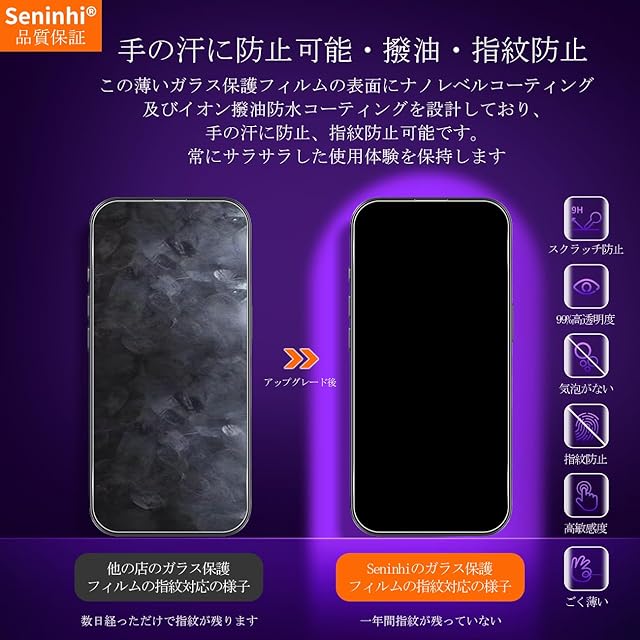<b>【Seninhi】</b><br>アイフォン17 pro 強化ガラス 保護フィルム<br> <b> 仕様</b><br> 厚さ: 0.26mm <br>光透過率: 99% <br>素材:国産AGC旭硝子ガラス <br>対応機種:アイフォン 17 pro <br><b>【同梱品】</b><br> 2 × 強化ガラスフィルム <br>2 × レンズ保護フィルム <br>1 × 取扱説明書 <br>1 × ガイド枠 <br>2 × スクリーンクリーニングキット <br>2 × ホコリ除去用ステッカー <br><br>特徴 <br><br><b>【9h高硬度】</b><br> 私たちの強化フィルムは国産AGC旭硝子ガラスを使用し、4.5時間の高温急冷と多重強化処理して、同じ厚さの通常のガラスフィルムに比べて約5倍の強さを持ち、ガラスフィルムは9Hの最も硬い表面硬度に達しました。ナイフなどの鋭いものでも傷を与えません。日常生活で気軽に対応できます。<br><br><b> 【飛散防止】</b><br> 飛散防止を通して、万が一ガラスが割れても破片が飛散しなく、破片による重傷事故を減らして、とても安全です。 <br><br><b>【高感度タッチ】</b><br> この強化フィルムは0.26mmのゴールデン厚さを設計しており、防爆する同時に、感度が高いタッチ体験と連続タッチを確保し、高感度でスムーズなオンスクリーン操作を実現し、ガラスフィルムを取り付けない画面とほぼ同じような使用体験を与えます。高感度でスムーズなオンスクリーン操作は様々なゲーム アプリケーションに適用します。<br><br><b> 【99%以上の携帯電話ケースに干渉しない】</b><br> 百件以上な携帯電話ケースをテストしましたが、適応率は 99%に達しました。高品質の接着剤を使用したので、携帯電話ケースに取り付けられている瞬間保護フィルムがわずかに浮き、軽く押すと気泡がきれいに消えます。<br><br><b> 【素人でも簡単に貼り付け】</b><br> ガラスフィルムの取扱説明書に張り付ける方法は詳しく記載したので、位置をよく合わせた後、上から軽く貼り付けると、シリコン吸着層が自動的に吸着し、気泡が発生しません。誰でも簡単に貼り付けられ、万が一失敗しても剥がして貼り直すことができます。<br><br><b> 三、ご注意事項:</b><br> 1.フィルムを貼り付ける前に、手をきれいに洗ってください。<br> 2.泡があれば、クロスを指に巻きつけて少しずつ絞りだしてください。 <br>3.貼り直しによる泡を防止するため、はがす際にフィルムの粘着面に手や物が触れないようご注意ください。<br> 4. 保護フィルムは過度の衝撃等を防止するものではありません。携帯電話の故障、紛失等の責任は負いかねます。 <br><br>四、アフターサービス ご購入日より180日以内に初期不良や、ヒビ・欠け・ホコリ混入・サイズ違い等の使用上の問題がございましたら、ご遠慮なく、いつでもお気軽にご連絡ください。私たちは具体的な問題により、お客様に満足できる解決策を提供します。