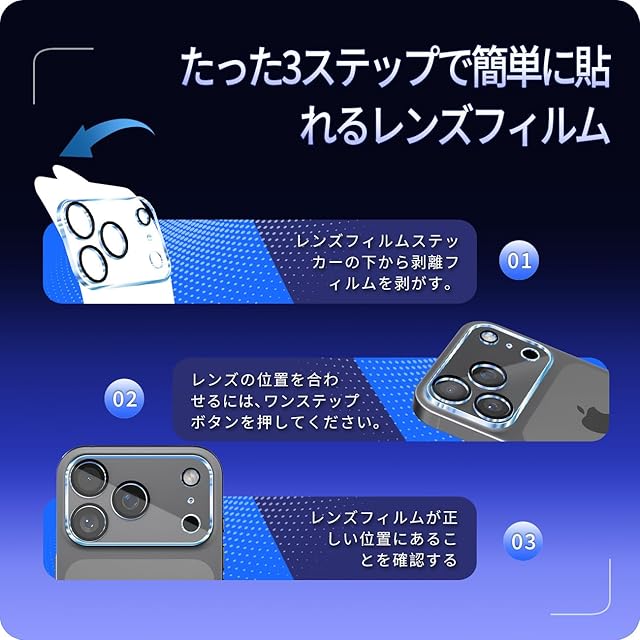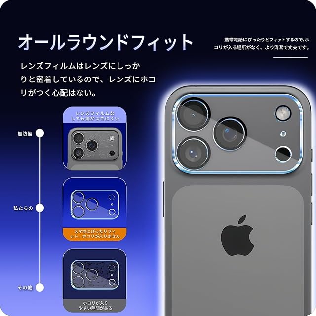 <b>【Seninhi】アイフォン17 Proレンズ保護フィルム について </b><br><br>仕様<br> 厚さ: 0.26mm <br>光透過率: 99% <br>素材:国産AGC旭硝子ガラス <br>対応機種:アイフォン 17 Pro <br><br> <br>【同梱品】</b><br>3 × レンズ保護フィルム <br> 3 × スクリーンクリーニングキット <br> 3 × ホコリ除去用ステッカー <br> <br> <b>特徴 </b> <br> <b>【9h高硬度】</b><br> 私たちの強化フィルムは日本AGC旭硝子ガラスを使用し、4.5時間の高温急冷と多重強化処理して、同じ厚さの通常のレンズガラスフィルムに比べて約5倍の強さを持ち、ガラスフィルムは9Hの最も硬い表面硬度に達しました。ナイフなどの鋭いものでも傷を与えません。日常生活で気軽に対応できます。 <br> <b>【飛散防止】</b><br> 飛散防止を通して、万が一ガラスが割れても破片が飛散しなく、破片による重傷事故を減らして、とても安全です。 <br> <b> 【ラウンドエッジ加工】</b><br>真空メッキプロセスを使用し、正しい丸みをエッジ処理して、不快感がありません。しかもエッジ部分へ衝撃が少なく、快適で滑らかな肌触りを提供する同時に、使用中に鋭い角のエッジで指を傷されません。 <br> <b>【99%以上の携帯電話ケースに干渉しない】</b><br> 百件以上な携帯電話ケースをテストしましたが、適応率は 99%に達しました。 <br> <b>【素人でも簡単に貼り付け】</b><br>iPhone 17レンズ保護フィルムの粘着面は自動吸着できるので、ガラスフィルムを携帯電話のレンズに合わせるだけで自然に吸着し、しかも気泡の発生しません。誰でも簡単に貼り付けられ、万が一失敗しても剥がして貼り直すことができます。 <br> <b> 三、ご注意事項:</b><br> 1.フィルムを貼り付ける前に、手をきれいに洗ってください。<br> 2.貼り直しによる泡を防止するため、はがす際にフィルムの粘着面に手や物が触れないようご注意ください。<br> 3. 保護フィルムは過度の衝撃等を防止するものではありません。携帯電話の故障、紛失等の責任は負いかねます。<br> <b> 四、アフターサービス ご購入日より180日以内に初期不良や、ヒビ・欠け・ホコリ混入・サイズ違い等の使用上の問題がございましたら、ご遠慮なく、いつでもお気軽にご連絡ください。私たちは具体的な問題により、お客様に満足できる解決策を提供します。</b>