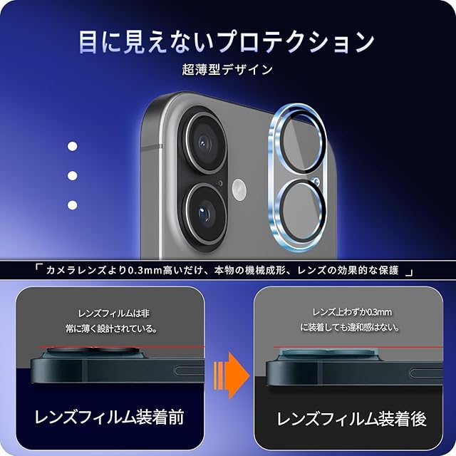 <b>【Seninhi】iPhone 17 レンズ保護フィルム について </b><br><br>仕様<br> 厚さ: 0.26mm <br>光透過率: 99% <br>素材:国産AGC旭硝子ガラス <br>対応機種:iPhone17 <br><br> <br>【同梱品】</b><br>3 × レンズ保護フィルム <br> 3 × スクリーンクリーニングキット <br> 3 × ホコリ除去用ステッカー <br> <br> <b>特徴 </b> <br> <b>【9h高硬度】</b><br> 私たちの強化フィルムは日本AGC旭硝子ガラスを使用し、4.5時間の高温急冷と多重強化処理して、同じ厚さの通常のレンズガラスフィルムに比べて約5倍の強さを持ち、ガラスフィルムは9Hの最も硬い表面硬度に達しました。ナイフなどの鋭いものでも傷を与えません。日常生活で気軽に対応できます。 <br> <b>【飛散防止】</b><br> 飛散防止を通して、万が一ガラスが割れても破片が飛散しなく、破片による重傷事故を減らして、とても安全です。 <br> <b> 【ラウンドエッジ加工】</b><br>真空メッキプロセスを使用し、正しい丸みをエッジ処理して、不快感がありません。しかもエッジ部分へ衝撃が少なく、快適で滑らかな肌触りを提供する同時に、使用中に鋭い角のエッジで指を傷されません。 <br> <b>【99%以上の携帯電話ケースに干渉しない】</b><br> 百件以上な携帯電話ケースをテストしましたが、適応率は 99%に達しました。 <br> <b>【素人でも簡単に貼り付け】</b><br>iPhone 17レンズ保護フィルムの粘着面は自動吸着できるので、ガラスフィルムを携帯電話のレンズに合わせるだけで自然に吸着し、しかも気泡の発生しません。誰でも簡単に貼り付けられ、万が一失敗しても剥がして貼り直すことができます。 <br> <b> 三、ご注意事項:</b><br> 1.フィルムを貼り付ける前に、手をきれいに洗ってください。<br> 2.貼り直しによる泡を防止するため、はがす際にフィルムの粘着面に手や物が触れないようご注意ください。<br> 3. 保護フィルムは過度の衝撃等を防止するものではありません。携帯電話の故障、紛失等の責任は負いかねます。<br> <b> 四、アフターサービス ご購入日より180日以内に初期不良や、ヒビ・欠け・ホコリ混入・サイズ違い等の使用上の問題がございましたら、ご遠慮なく、いつでもお気軽にご連絡ください。私たちは具体的な問題により、お客様に満足できる解決策を提供します。</b>