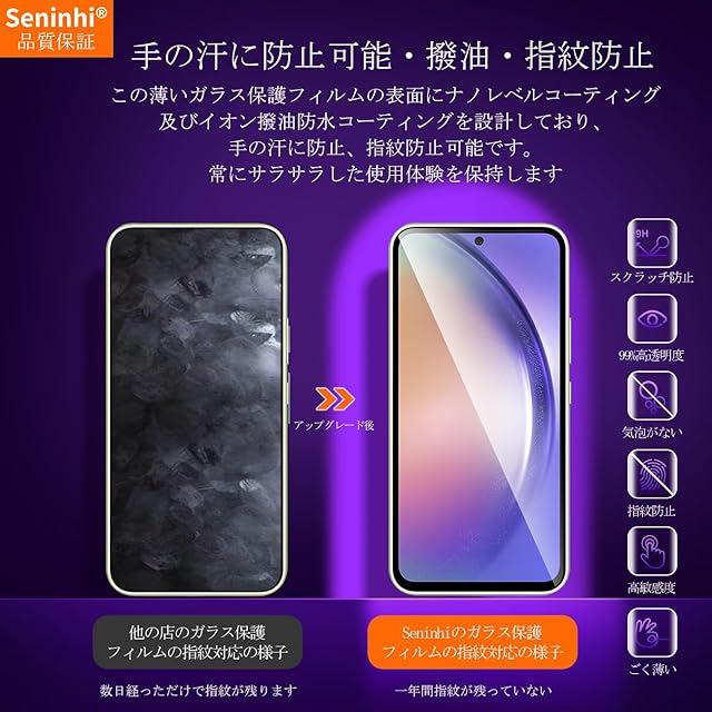 ☞【専用設計】Galaxy A54 SC-53D SCG21 専用に設計した保護フィルムなので、必ずご購入前にお使いの携帯電話の機種をご確認ください。(お買い得な4点セット)液晶保護フィルム*2枚+レンズ保護フィルム*2枚の組み合わせ、1度のご購入で、携帯電話の保護フィルムとカメラ保護フィルムが入っております。【正規品】Seninhi ブランドは 10 年間携帯電話保護フィルムの製造しており、最高品質の保護フィルムを生産することを約束します。市販の高価な保護フィルムと同じですが、価格がもっと安いので、お客様に大変ご愛顧いただき、月間販売数は20,000枚を超えました。弊社の製品は購入価値があります。安心して当社の製品をお買い求めください。