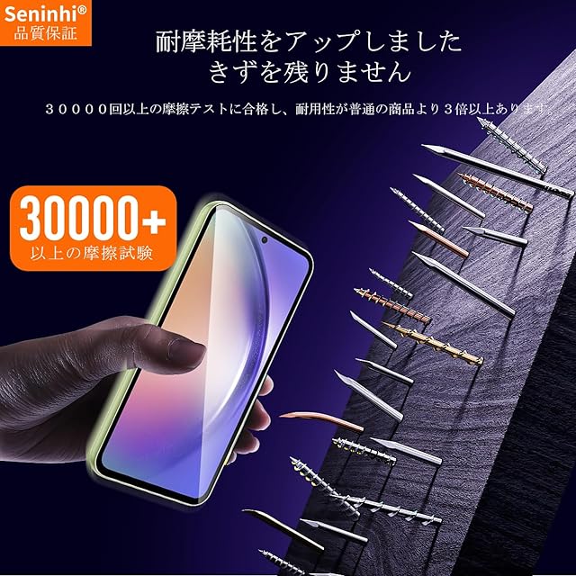 <b>【Seninhi】</b><br> Galaxy A54 SC-53D SCG21 強化ガラス 保護フィルム<br> <b> 仕様</b><br> 厚さ: 0.26mm <br>光透過率: 99% <br>素材:国産AGC旭硝子ガラス <br>対応機種:Galaxy A54 SC-53D SCG21 <br><b>【同梱品】</b><br> 2 × 強化ガラスフィルム <br>2 × レンズ保護フィルム <br>1 × 取扱説明書 <br>2 × スクリーンクリーニングキット <br>2 × ホコリ除去用ステッカー 特徴 <br><br><b>【9h高硬度】</b><br> 私たちの強化フィルムは 国産AGC旭硝子ガラスを使用し、4.5時間の高温急冷と多重強化処理して、同じ厚さの通常のガラスフィルムに比べて約5倍の強さを持ち、ガラスフィルムは9Hの最も硬い表面硬度に達しました。ナイフなどの鋭いものでも傷を与えません。日常生活で気軽に対応できます。<br><br><b> 【飛散防止】</b><br> 飛散防止を通して、万が一ガラスが割れても破片が飛散しなく、破片による重傷事故を減らして、とても安全です。 <br><br><b>【高感度タッチ】</b><br> この強化フィルムは0.26mmのゴールデン厚さを設計しており、防爆する同時に、感度が高いタッチ体験と連続タッチを確保し、高感度でスムーズなオンスクリーン操作を実現し、ガラスフィルムを取り付けない画面とほぼ同じような使用体験を与えます。高感度でスムーズなオンスクリーン操作は様々なゲーム アプリケーションに適用します。<br><br><b> 【99%以上の携帯電話ケースに干渉しない】</b><br> 百件以上な携帯電話ケースをテストしましたが、適応率は 99%に達しました。高品質の接着剤を使用したので、携帯電話ケースに取り付けられている瞬間保護フィルムがわずかに浮き、軽く押すと気泡がきれいに消えます。<br><br><b> 【素人でも簡単に貼り付け】</b><br> ガラスフィルムの取扱説明書に張り付ける方法は詳しく記載したので、位置をよく合わせた後、上から軽く貼り付けると、シリコン吸着層が自動的に吸着し、気泡が発生しません。誰でも簡単に貼り付けられ、万が一失敗しても剥がして貼り直すことができます。<br><br><b> 三、ご注意事項:</b><br> 1.フィルムを貼り付ける前に、手をきれいに洗ってください。<br> 2.泡があれば、クロスを指に巻きつけて少しずつ絞りだしてください。 <br>3.貼り直しによる泡を防止するため、はがす際にフィルムの粘着面に手や物が触れないようご注意ください。<br> 4. 保護フィルムは過度の衝撃等を防止するものではありません。携帯電話の故障、紛失等の責任は負いかねます。 <br><br>四、アフターサービス ご購入日より180日以内に初期不良や、ヒビ・欠け・ホコリ混入・サイズ違い等の使用上の問題がございましたら、ご遠慮なく、いつでもお気軽にご連絡ください。私たちは具体的な問題により、お客様に満足できる解決策を提供します。