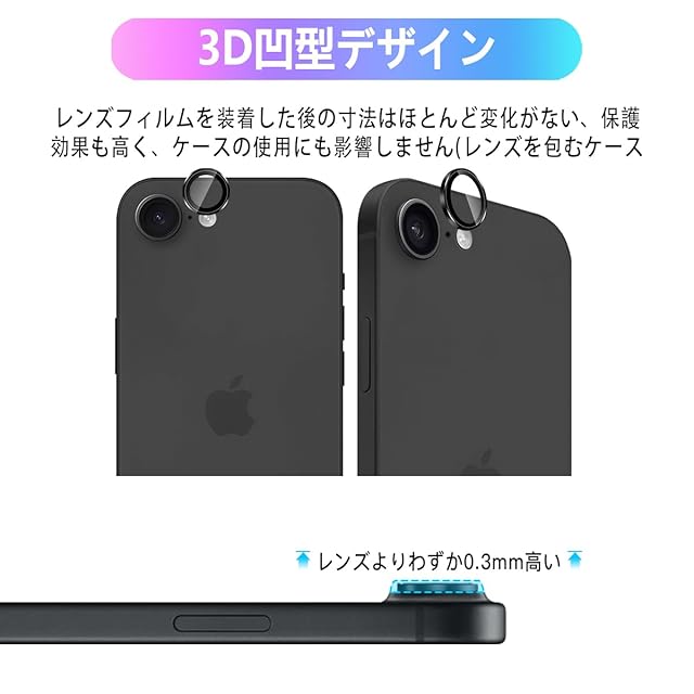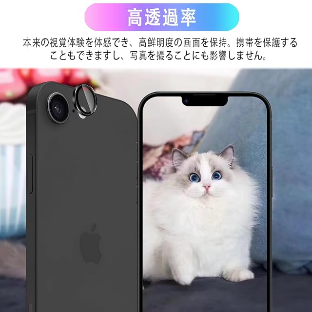 【黒縁取り仕上げ仕様 高透過率】 対応 アイフォン 16E 保護フィルム。本製品は露出オーバー防止のために、カメラレンズのガラスカバーに黒縁取りをした設計を使用します。カメラの自動露出機能を干渉せず、明るい被写体でも暗い被写体でも適正な明るさの写真を撮影することができます。高透過率で、元々の画質を損なう事無く、色鮮やかに映し、本来の美しい画面を鮮明に保ち続けます。